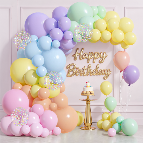- Pastel Balloon Arch Kit:This colorful Balloons includes 139 high-quality pieces featuring a beautiful pastel rainbow palette. You'll receive a variety of pastel ballons, including 24pcs pink balloons, 21pcs blue balloons, 21pcs purple balloons, 21pcs orange balloons, 21pcs yellow balloons and 21pcs green balloons. The pastel balloon arch also includes 10pcs colorful confetti balloons and 1 roll of adhesive tape and 5 adhesive dots for added sparkle and fun, providing everything you need to create a stunning, photo-worthy pastel balloon garland for any celebration.