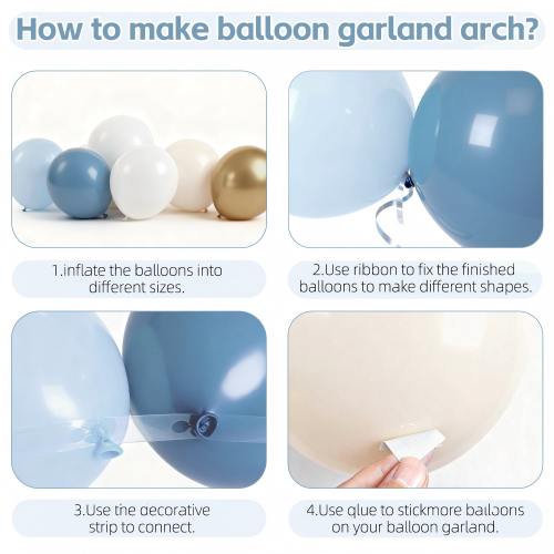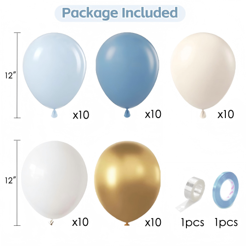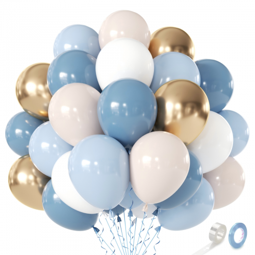 • Dusty Blue balloons: This blue and white balloons includes 10pcs dusty blue balloons, 10pcs light blue balloons, 10pcs white balloons, 10pcs sand white balloons, and 10pcs chrome gold balloons. The color combination is elegant and chic, and the addition of stylish baby blue, dusty blue, and chrome gold balloons ensures your party decorations stand out.