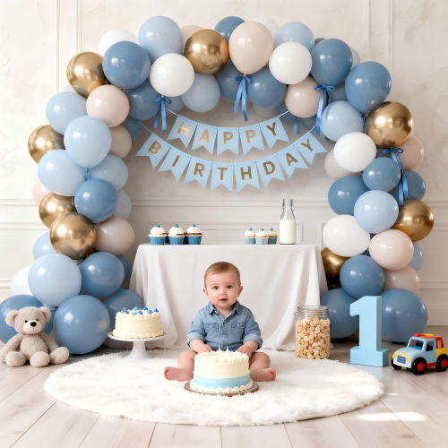 • Blue and White Balloons: This carefully selected set of blue and gold balloons, including light blue, baby blue, white, and sand white balloons, along with the luxurious sheen of chrome gold balloons, provides a coordinated and photogenic decoration for any event, making it ideal for creating modern balloon garlands and arches.